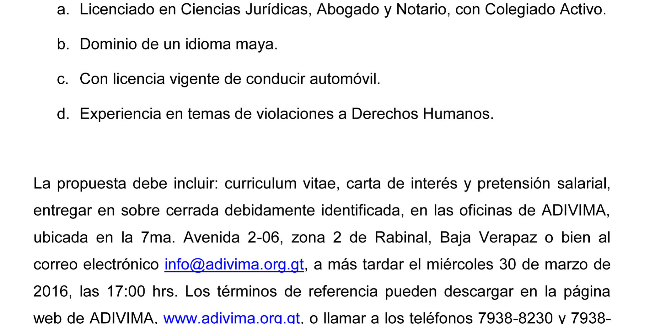 Mar232016Noticias RecientesConvocatoria.ampliación TdR de abogado-ampliación Convocatoria.ampliación Categoría: Noticias RecientesPor Administrador Adivimamarzo 23, 2016Deja un comentario Autor: Administrador Adivima Navegación entre publicacionesAnteriorPublicación anterior:CONMEMORACIONSiguientePublicación siguiente:AMPLIACIÓN DE CONVOCATORIA PARA LA CONTRATACIÓN DE PROFESIONALRelated postsCONVOCATORIA LABORAL 2,026enero 6, 2026Convocatoria Programa de Becas año 2,026noviembre 19, 2025CONVOCATORIA TURISMO RURAL Y AULAS VIVAS IMPARTIDO POR INTECAP.octubre 10, 2025Sin títulooctubre 9, 2025CONVOCATORIA SERVICIO AL CLIENTE IMPARTIDO POR INTECAP.octubre 9, 2025TDR/EXPO ITINERANTEjunio 10, 2025