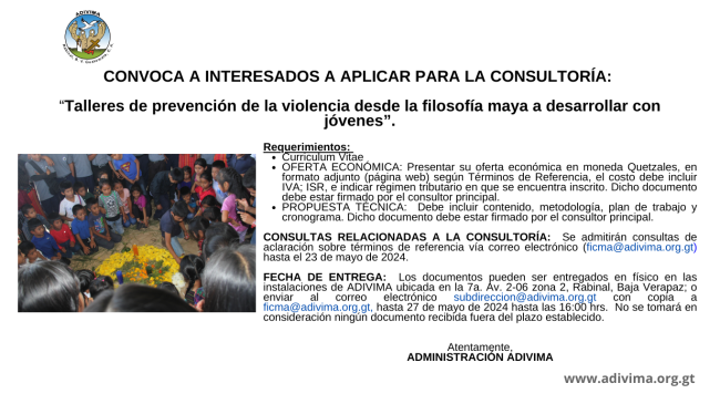 CONVOCATORIA PARA CONSULTORIA Noticias RecientesPor Administrador Adivimamayo 15, 2024Deja un comentario6.2-FormTdR-SL-Prev-May-Oct-2024Descarga 5.8-Formato-oferta-economica-SLDescarga